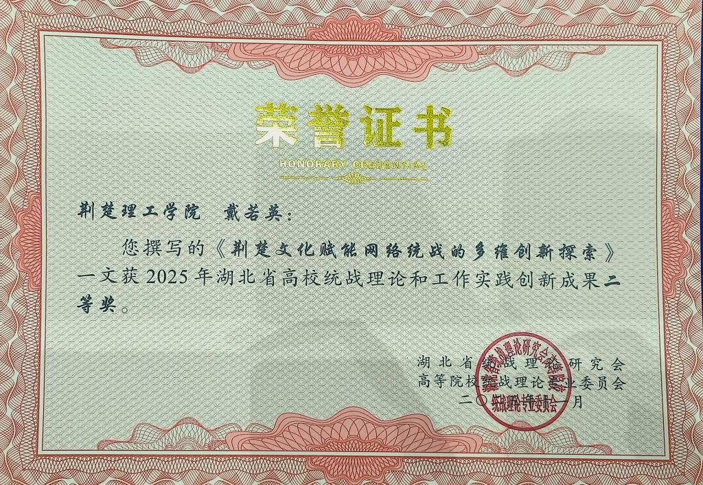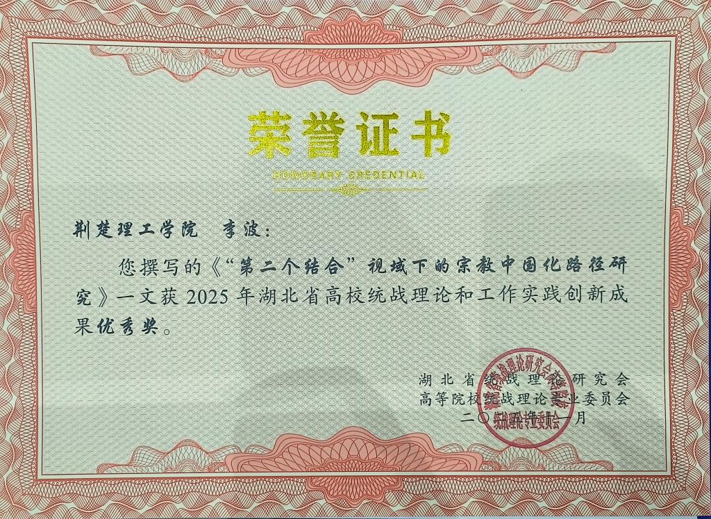 近日,湖北省高校统战理论研究会第40次年会召开,会议对2025年湖北省高校优秀统战理论和工作实践创新成果进行了表彰。公司教师戴若英撰写的《荆楚文化赋能网络统战的多维创新探索》荣获二等奖、教师李波撰写的《“第二个结合”视域下的宗教中国化路径研究》荣获优秀奖。
