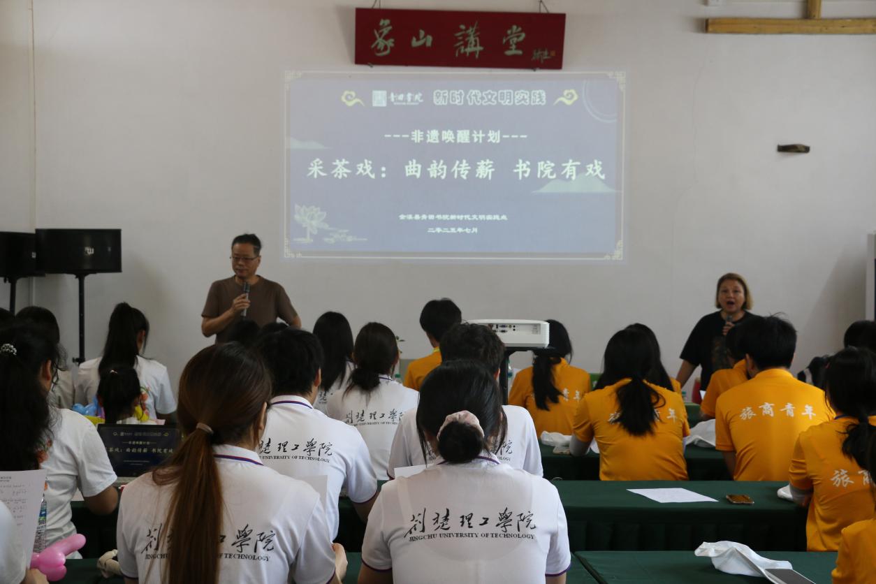 活动现场,“蒲公英”志愿服务队的队员们与当地群众一同体验了江西抚州采茶戏经典选段《千不怪万不怪》。伴着悠扬的曲调,队员们跟着抚州戏曲艺人中国音乐家协会会员、抚州市戏曲家协会常务理事吴越老师和邱巧琴导演学唱学演,举手投足间尽显采茶戏的乡土韵味。为了促进各个公司之间的民族文化交流,“蒲公英”志愿服务队的许奥博等三名志愿者,带来了土家族特色的《六口茶》与《新龙船调》表演,江西旅游商贸职业公司的同学则献上韵味醇厚的京剧选段。当土家族旋律与采茶戏的乡音、京剧的唱腔交融碰撞,多元民族文化的火花在现场绽放,让在场众人深切感受到传统民族文化交融共生的独特魅力。