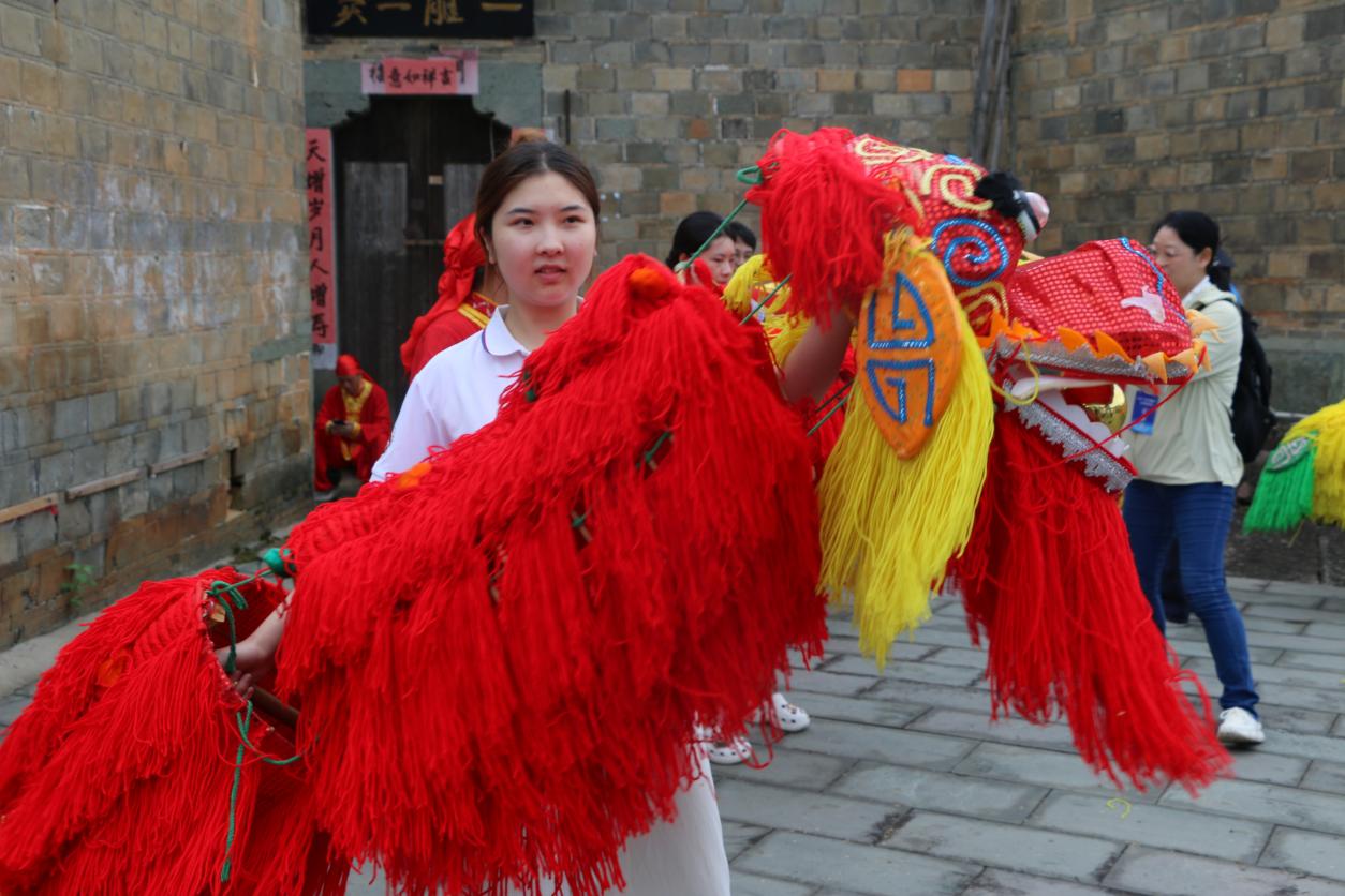 古村广场上,非遗“金溪手摇狮”展演展现活态传承。这项明末清初的技艺以手腕操控狮具,“舐毛”“扑球”等动作及劝和桥段,暗合陆九渊“心即理”中“和”的内核,队员们通过观察学习,了解其传承脉络。