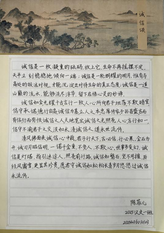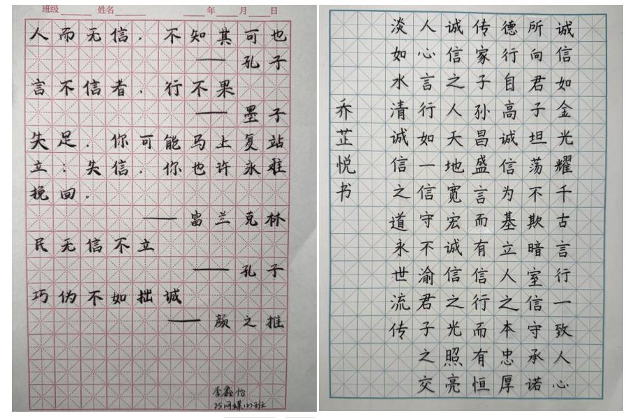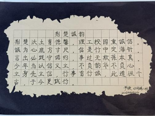 自活动开始以来,同学们积极参与,以多元形式投入创作。有人晨起展纸,有人夜深落笔;有的以颜筋柳骨誊写诚信格言,有的以自撰诗文抒发对美德的体悟。每一幅作品都是一次真诚的自我对话,每一次运笔皆成为品格锤炼的契机。
